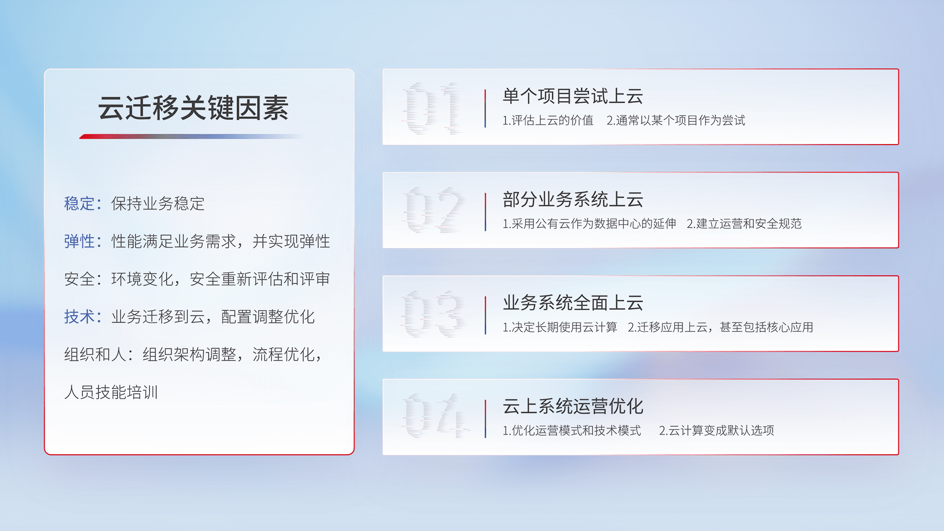 结合实际业务,,,,从规划设计、、云平台选型、、云原生改造、、、、数据迁移、、、、集成交付,,迁移全过程为客户识别最佳上云路径,,做好风险识别管理,,,设计网络架构、、、、身份权限、、安全审计合规、、、操作审计、、日志审计、、监控告警策略、、、多站点容灾设计等,,,对云上基础设施进行整体规划,,,提升IT治理水平,,,,以满足弹性、、、、高可用、、高性能的需求。。。