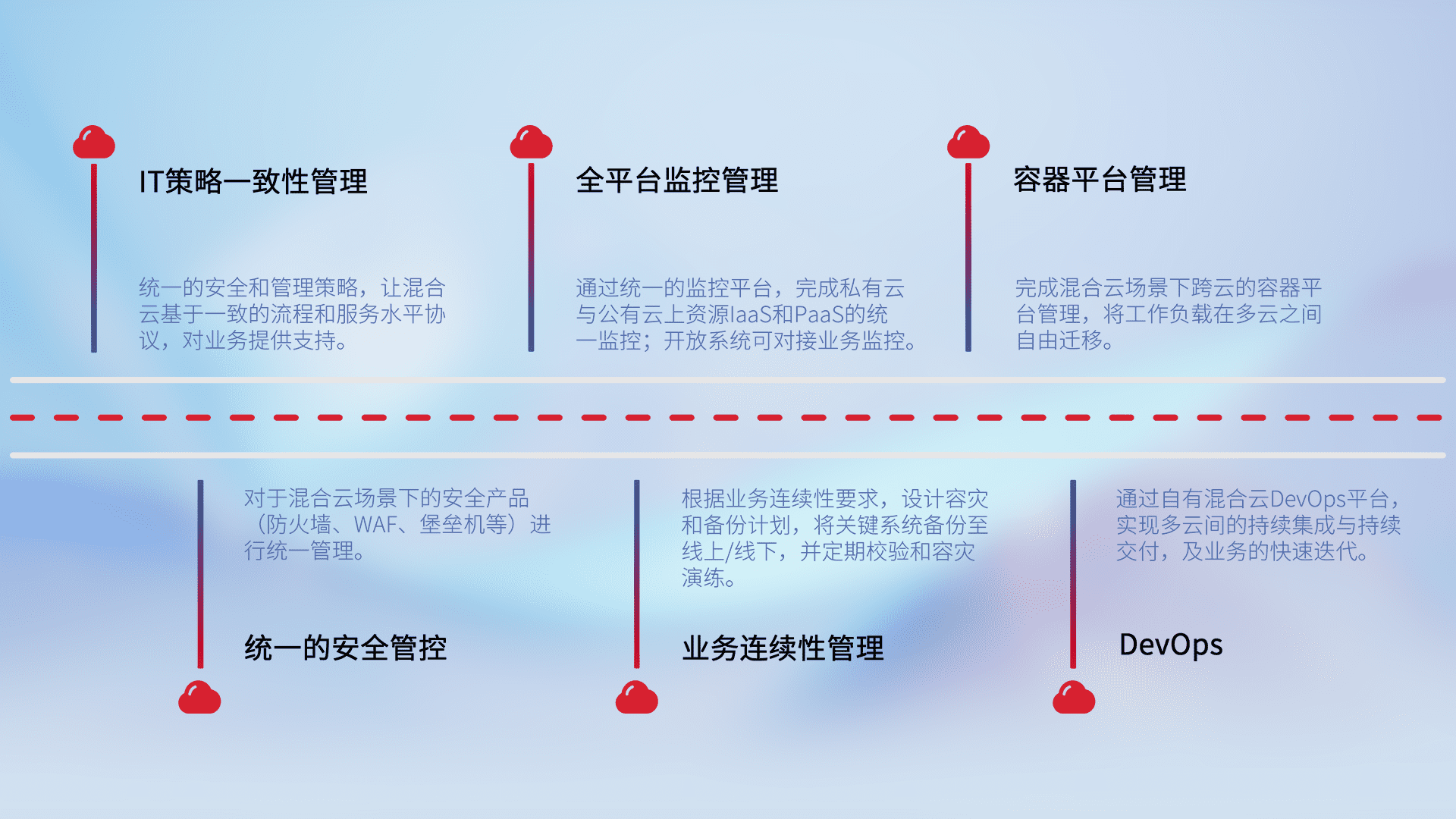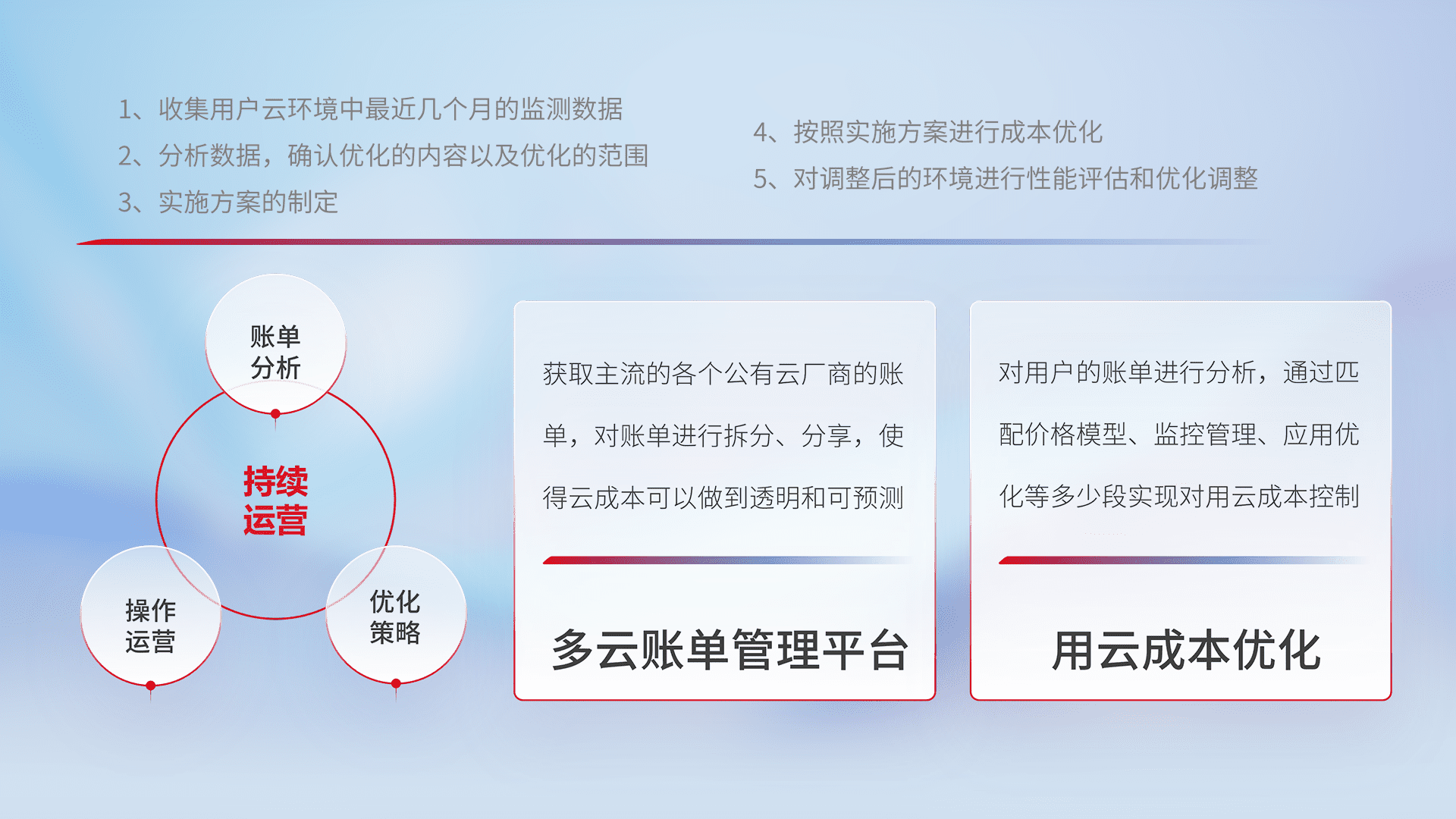 通过多云纳管,,,,以统一的资源数据模型把客户的云资源进行抽象和封装,,,,进而实现对多云资源的统一操作,,保障云资源管理的可靠性、、稳定性与可用性。。量身定制化运维内容,,,配置、、、开发运维、、、补丁管理、、、、备份、、、监控、、认证和访问管理、、、审计和日常巡检等,,保障在用云过程中的可靠度,,稳定度以及高可用率。。。。
