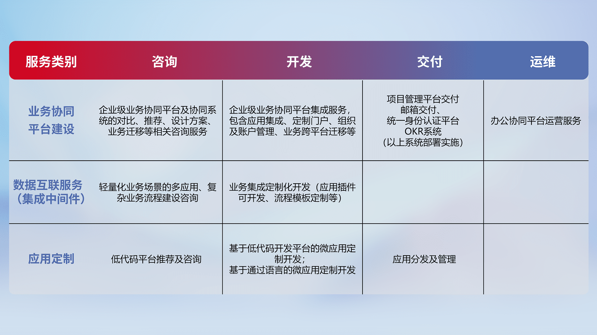 针对钉钉、、企微、、IDaas等平台级产品提供产品的规划、、方案、、、、交付、、定制化开发等服务,,,实现如统一协同办公、、、、智能客户服务、、、混合会议管理、、智能数据查询、、、等业务场景,,,实现数字化转型。。